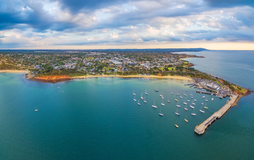 Main image… Aerial view of Mornington Peninsula and pier at sunset – Picture by Greg Brave, Shutterstock
