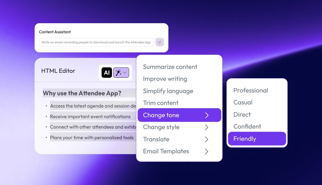 The product suite reflects this real‑time ambition. An Attendee Assistant, already available, provides on‑demand guidance during events. A Content Assistant supports the creation of consistent communications, while a Planner Assistant – due to launch soon – is designed to bring insights and support faster decision‑making.